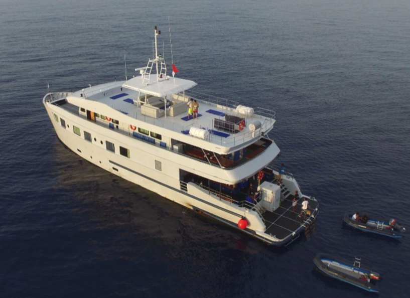 Als Alternative können wir eine 34 Meter Motoryacht anbieten, die mit allem Komfort ausgestattet ist und Platz für bis zu 20 Tauchgäste bietet. Neben bequemen Doppelkabinen mit eigenem Bad/WC sind auch 4-Bett-Kabinen mit Stockbetten vorhanden. Das Schiff verfügt über eine komplett eingerichtete Profiküche, die die Gäste täglich mit internationalen Spezialitäten verwöhnt. Im Reisepreis ist Vollpension mit einem reichhaltigen Frühstücksbuffet und zwei warmen Mahlzeiten täglich enthalten.