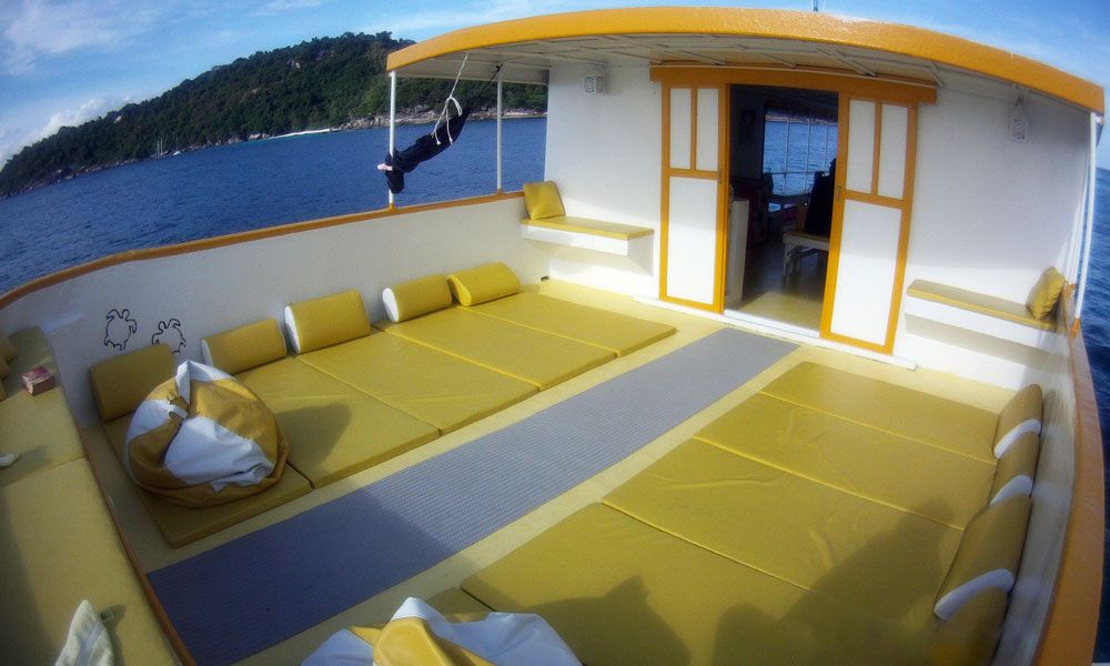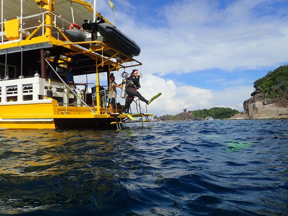 Von der großzügigen Tauchplattform aus ist es nur noch ein Schritt in die herrliche Unterwasserwelt der Andamansee. Inklusive des Nachttauchgangs lassen sich täglich bis zu vier Tauchgänge an unterschiedlichen Spots realisieren.