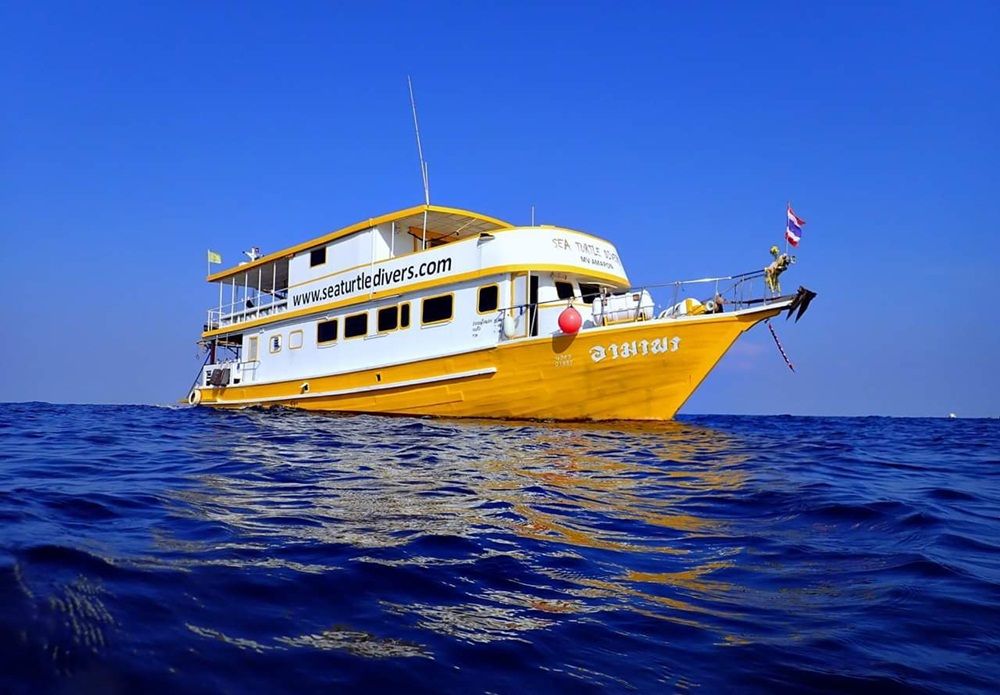 34 Meter Tauchschiff. Das Boot verfügt über komfortable Doppelkabinen (klimatisiert), WCs und Duschen, beschattete Sonnendecks, Vollpension und die Möglichkeit zur Thaimassage.